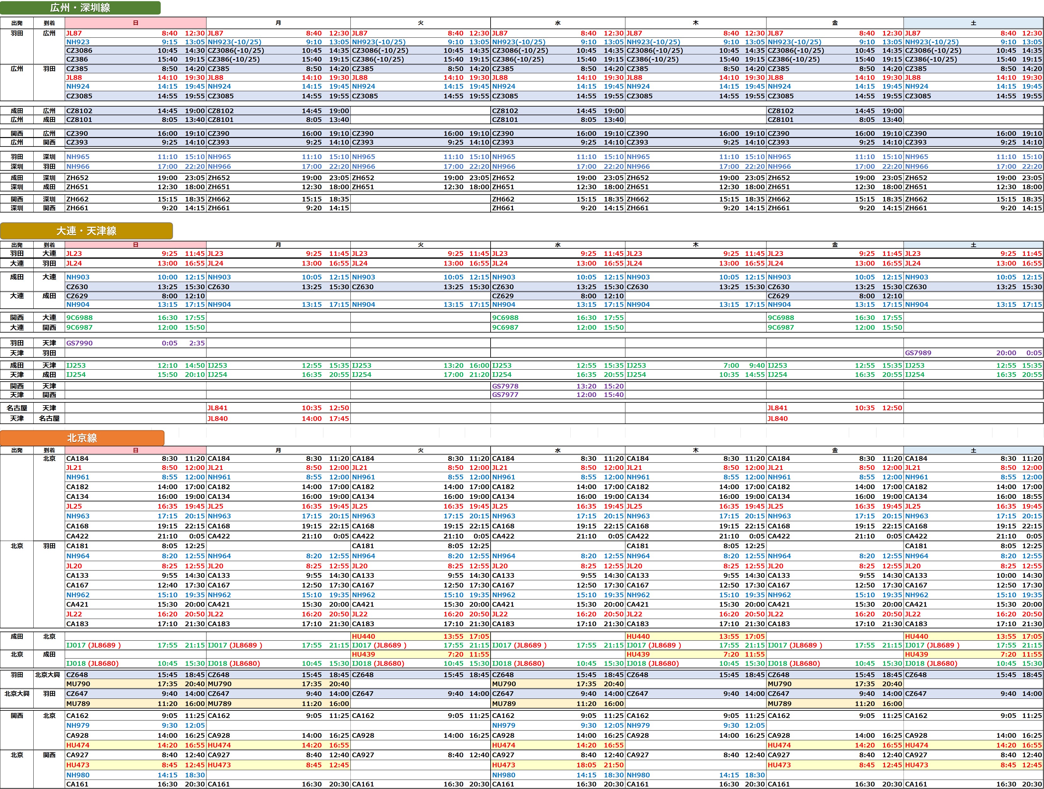 日中フライト時刻表 北京・広州 深圳 大連 天津