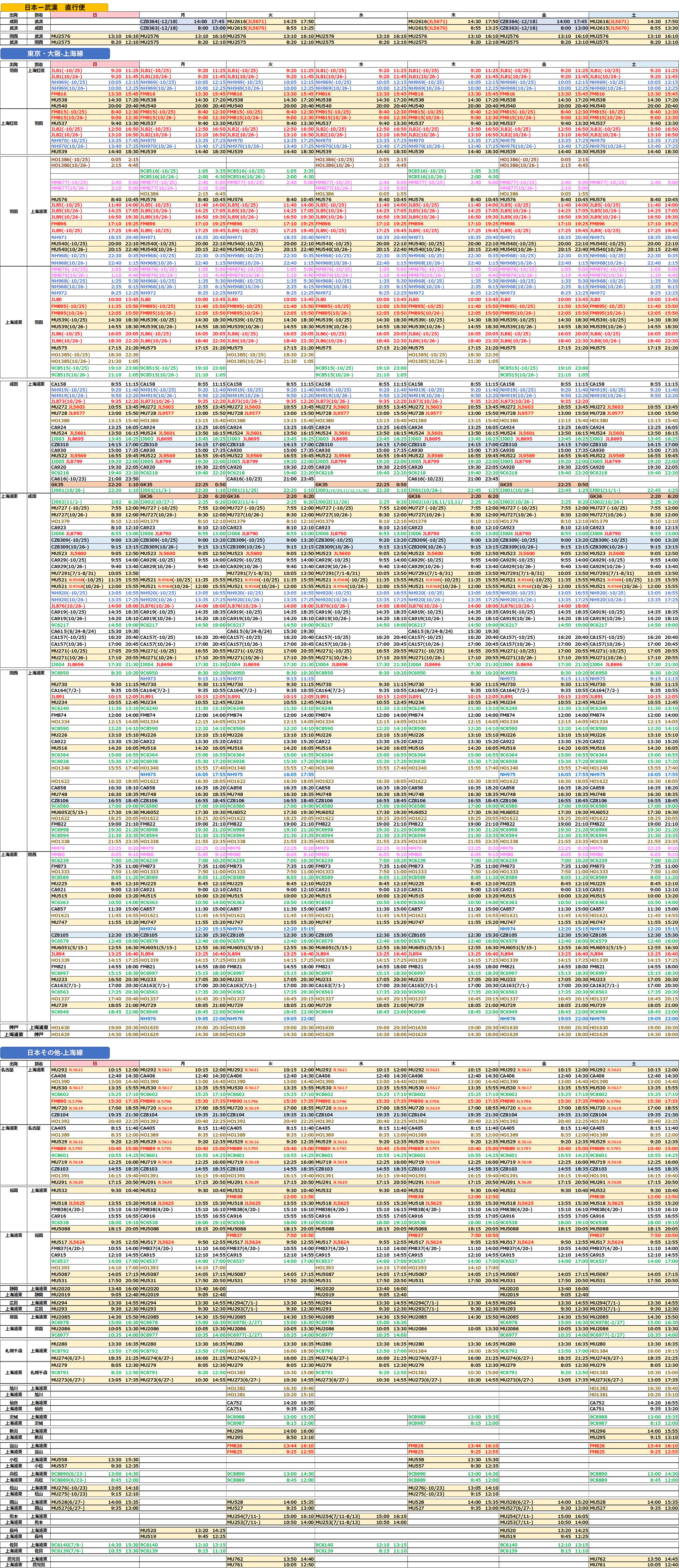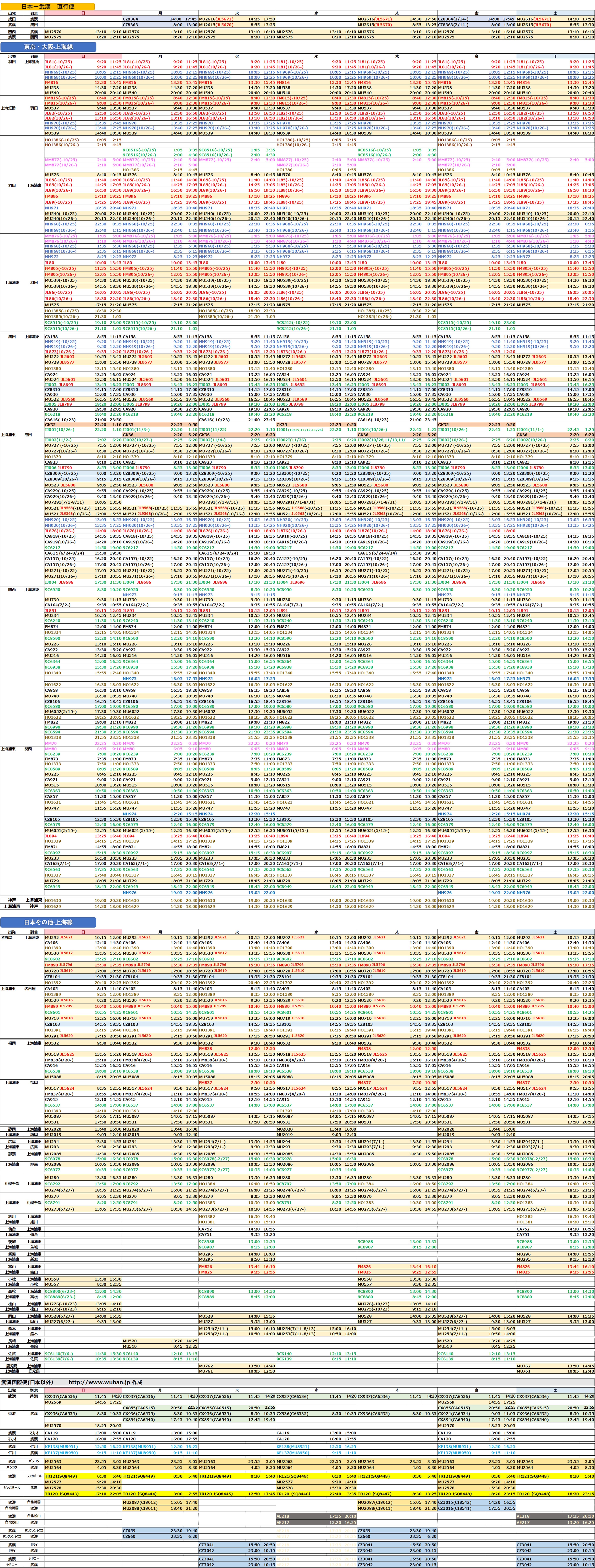 2025年 最新日中フライト時刻表 上海 武漢