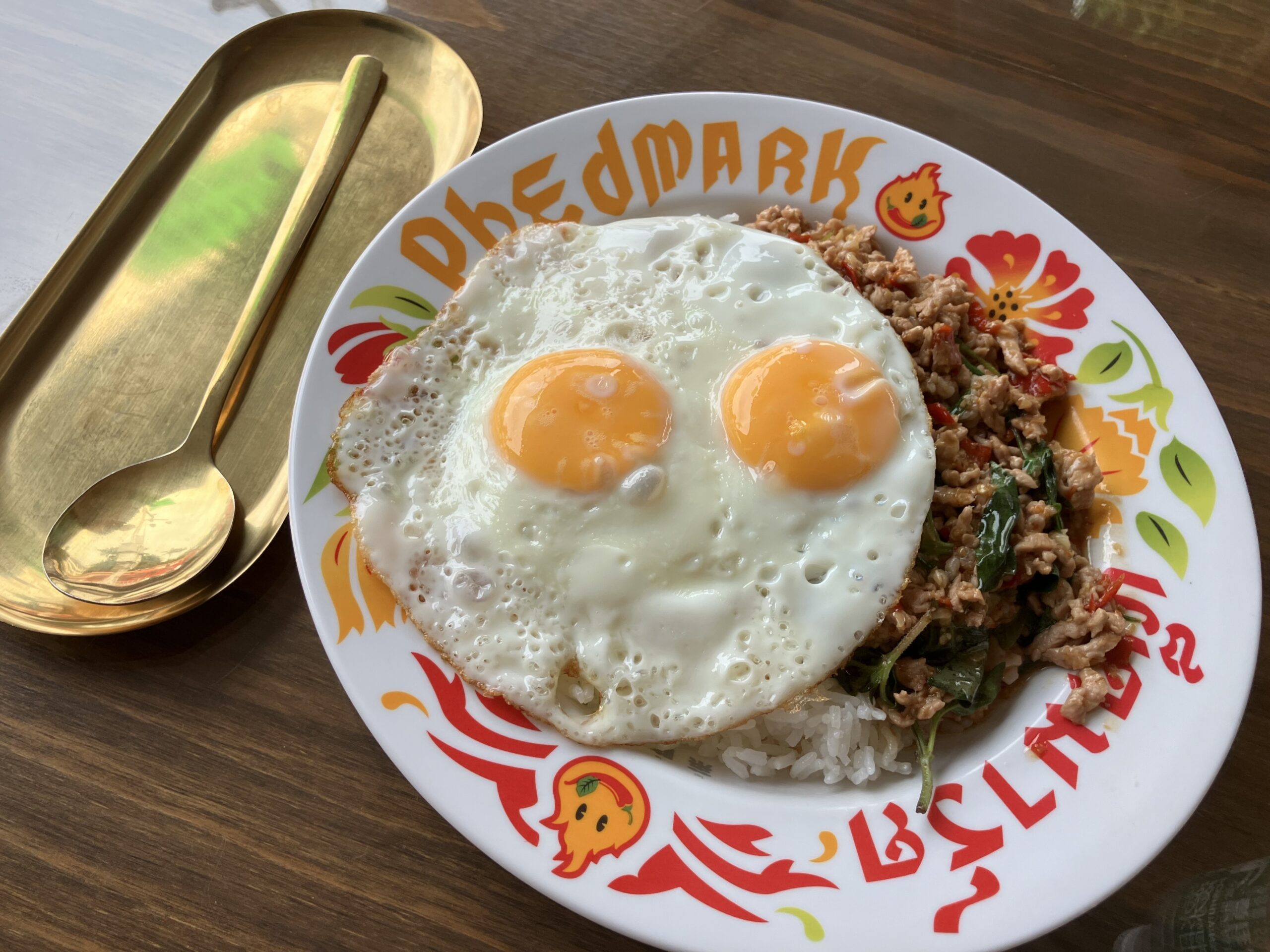 余談ながら、こちらでガパオライスを注文すると、バンコクの有名ガパオ専門店、ペッマーク (Phed Mark) の皿で提供されるので面白い。気分は、すでにしてエカマイのバスターミナルだ。