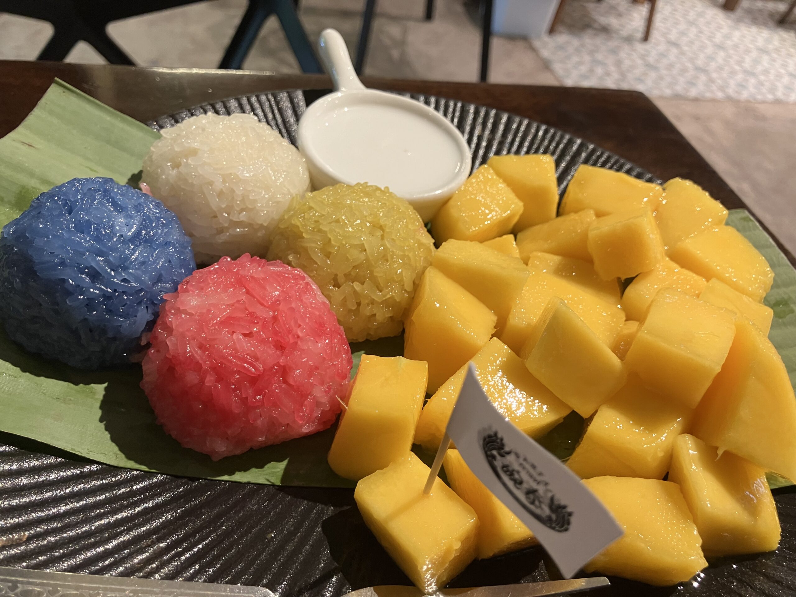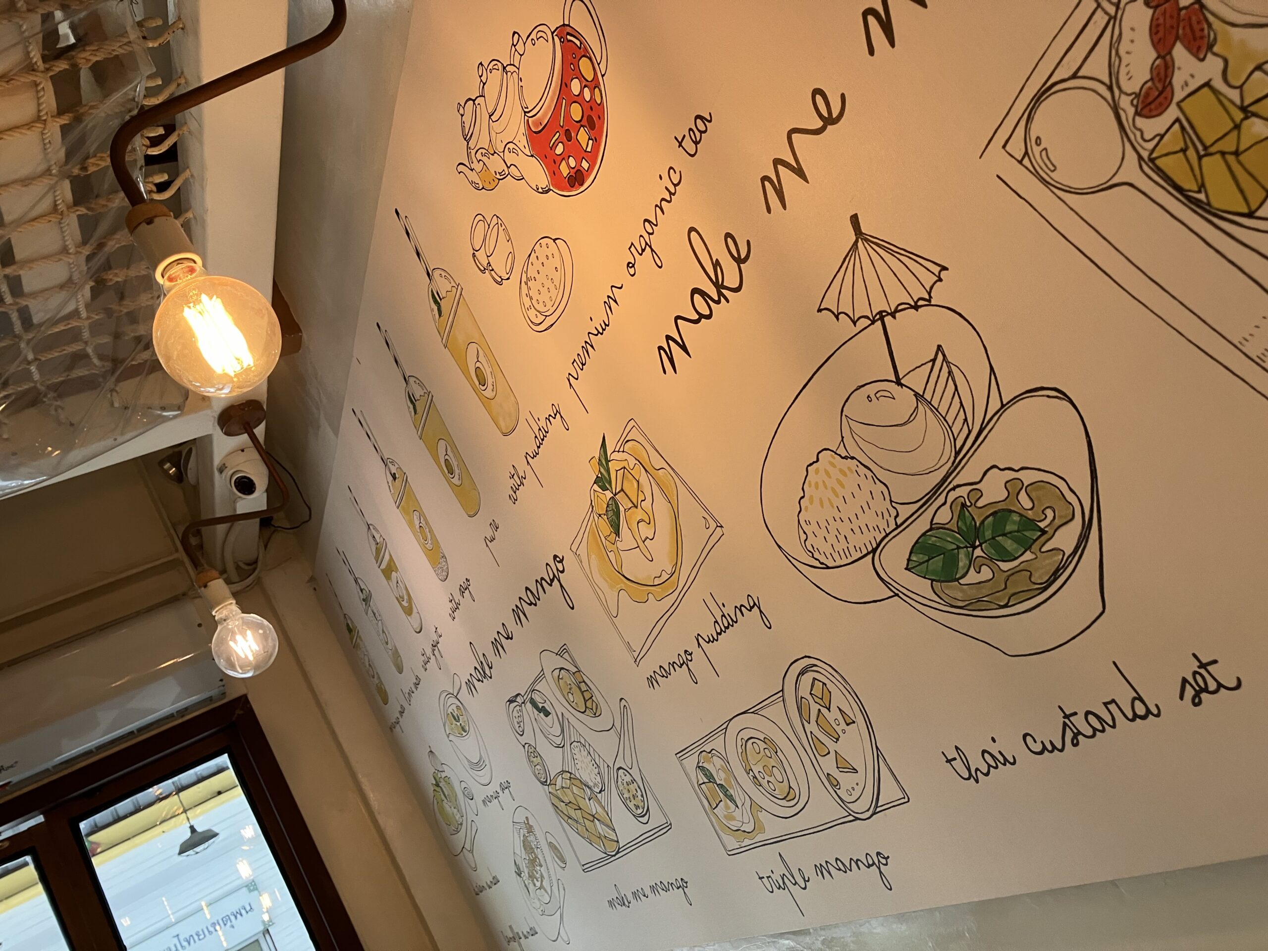 ここでは、もち米マンゴー以外にも、タイのデザート、ロティ (โรตี:Roti) があったり、タイティーも売られていて、メニューは多岐にわたる。いわゆる食事メニューも充実している。