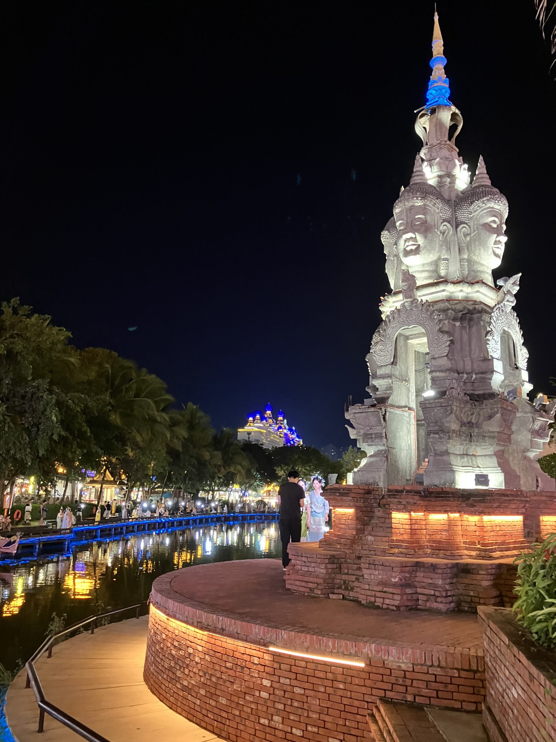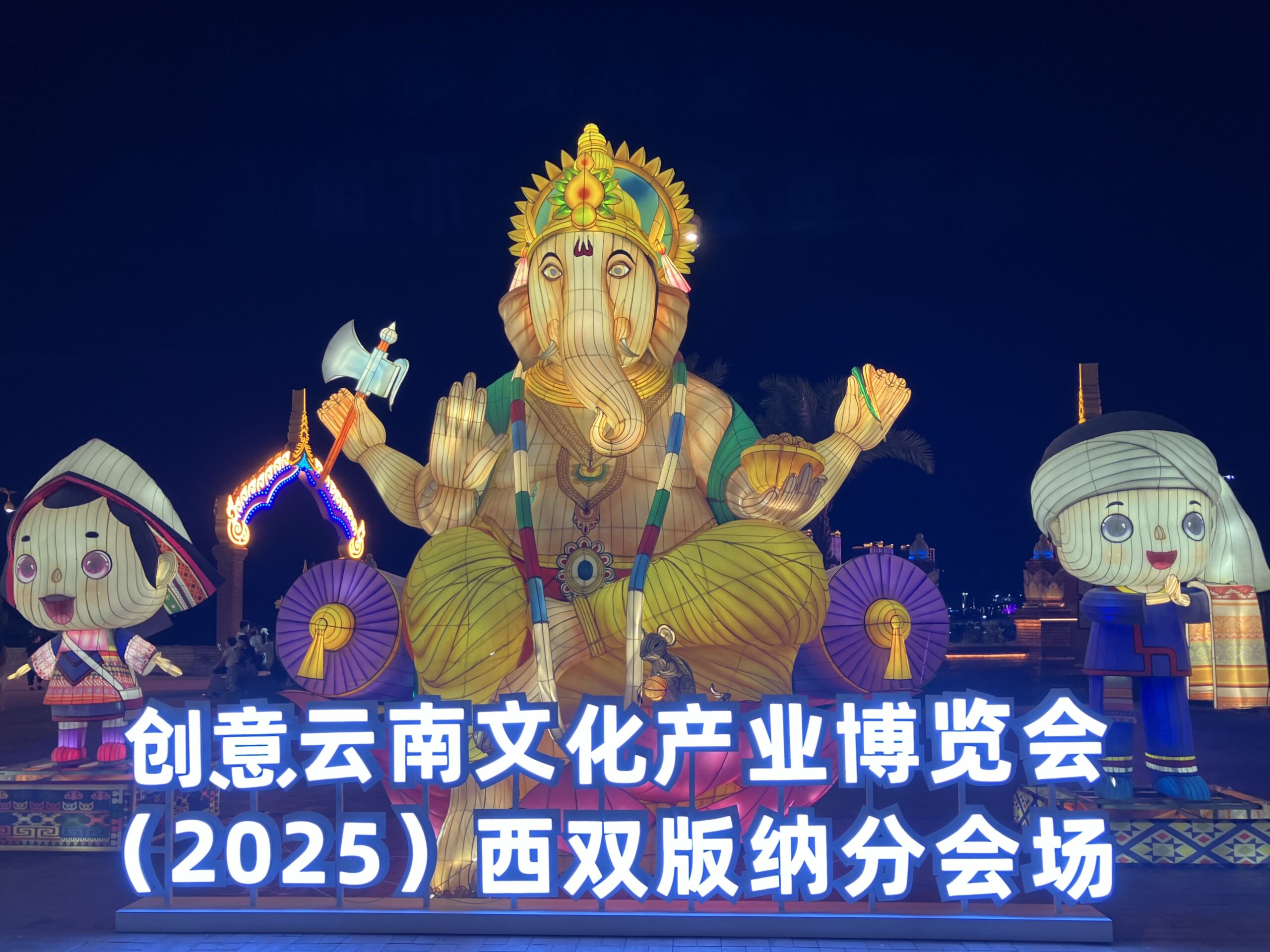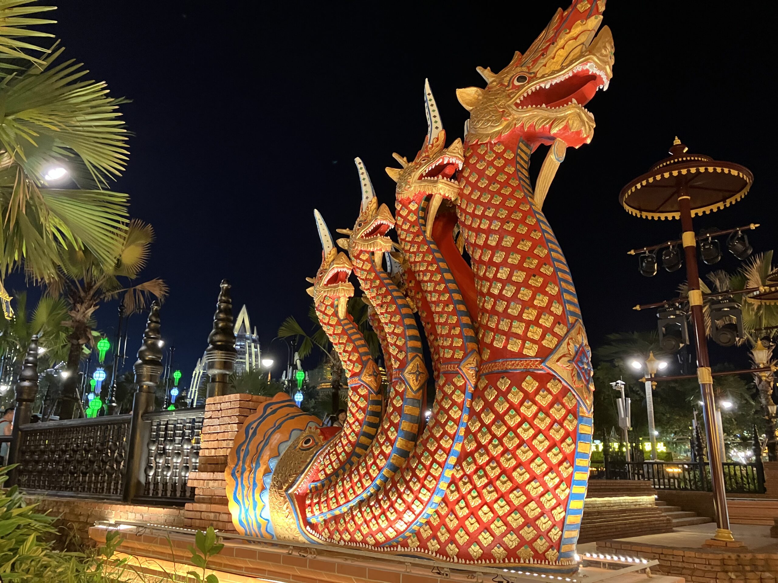中国で古鎮巡りをすれば、どこも灰白色の建物に紅の灯籠のイメージ。そう、われわれ氷河期世代が大陸に憧れるきっかけとなった、チェン・カイコー (陳凱歌) 映画の世界観だ。ひるがえって、ここ西双版納ではそんな中華的陰翳礼讃の美学なぞ、どこ吹く風。そこかしこに極彩色のライト。龍の代役を務めるのは象。ともすると蛇に見えてしまう石像は、蛇ではなくナーガ神だ。タイでも、東北部のイサーン地方の奥に行くほど、つまりラオスに近づくほど、ナーガ信仰が強まるのを体感できるが、ここはその源流の地。メコン川を挟んだその向かいは、ラオスだ。