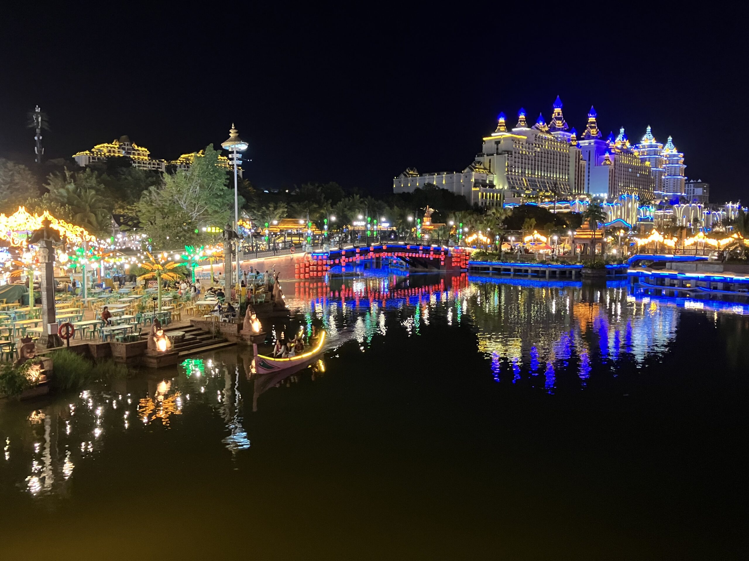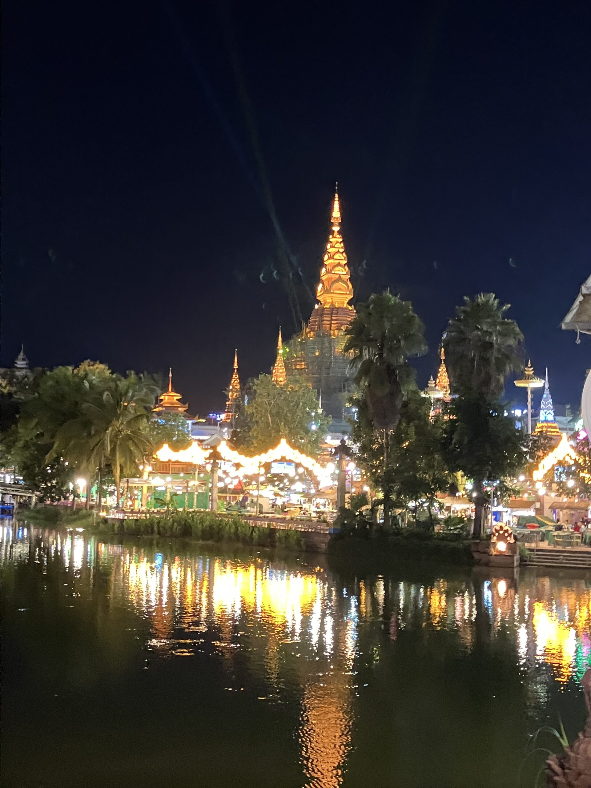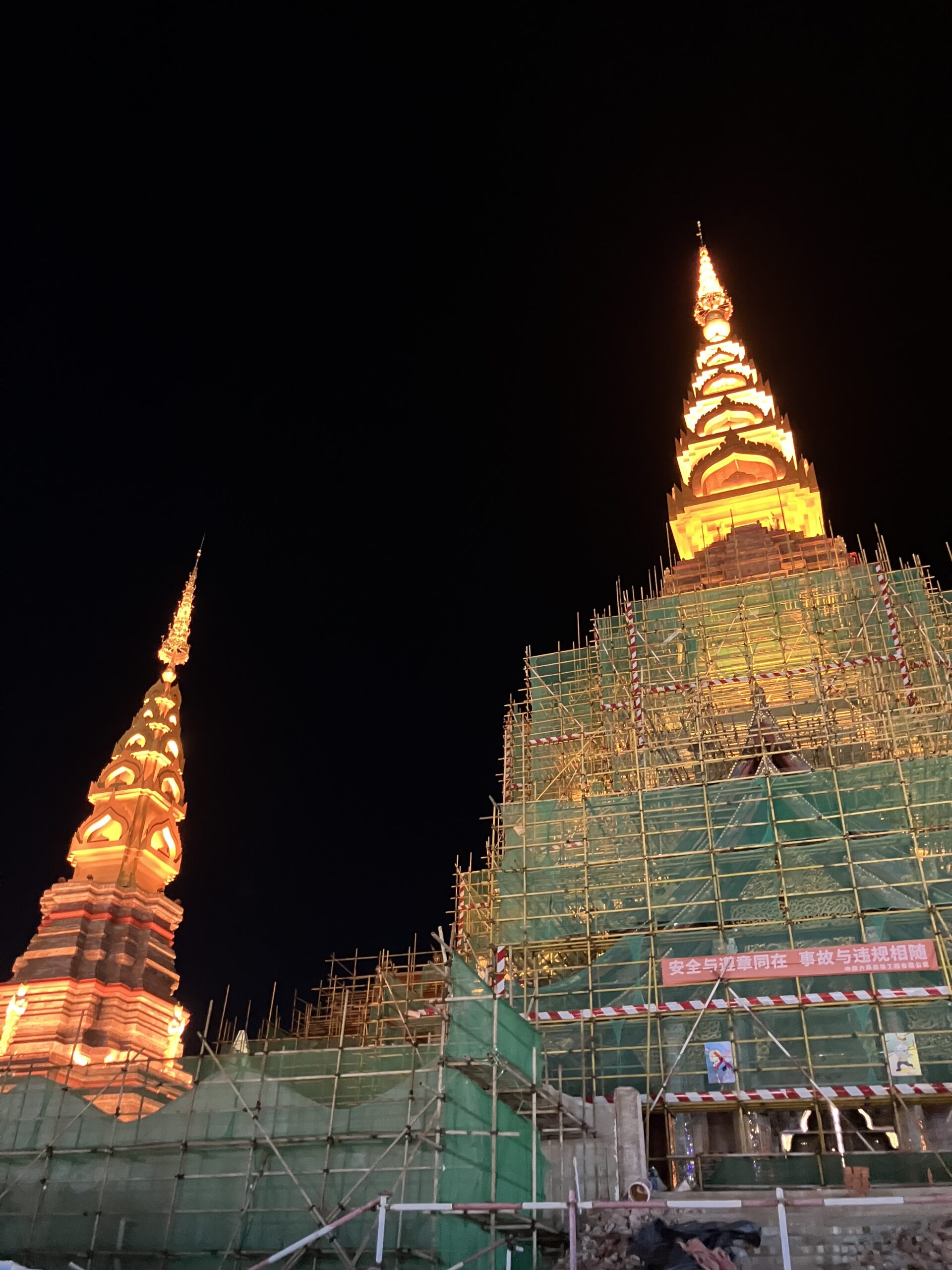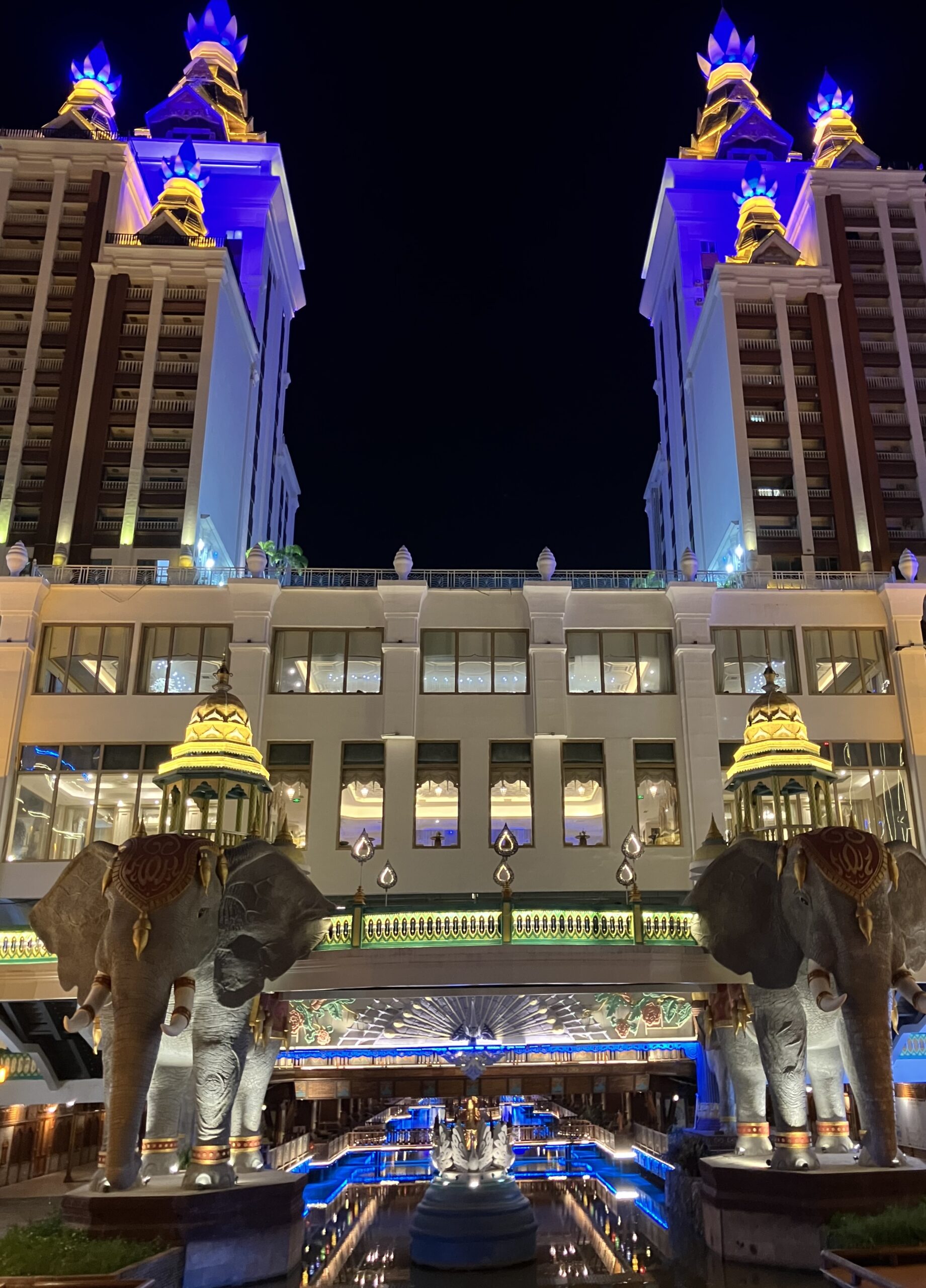 中国で古鎮巡りをすれば、どこも灰白色の建物に紅の灯籠のイメージ。そう、われわれ氷河期世代が大陸に憧れるきっかけとなった、チェン・カイコー (陳凱歌) 映画の世界観だ。ひるがえって、ここ西双版納ではそんな中華的陰翳礼讃の美学なぞ、どこ吹く風。そこかしこに極彩色のライト。龍の代役を務めるのは象。ともすると蛇に見えてしまう石像は、蛇ではなくナーガ神だ。タイでも、東北部のイサーン地方の奥に行くほど、つまりラオスに近づくほど、ナーガ信仰が強まるのを体感できるが、ここはその源流の地。メコン川を挟んだその向かいは、ラオスだ。