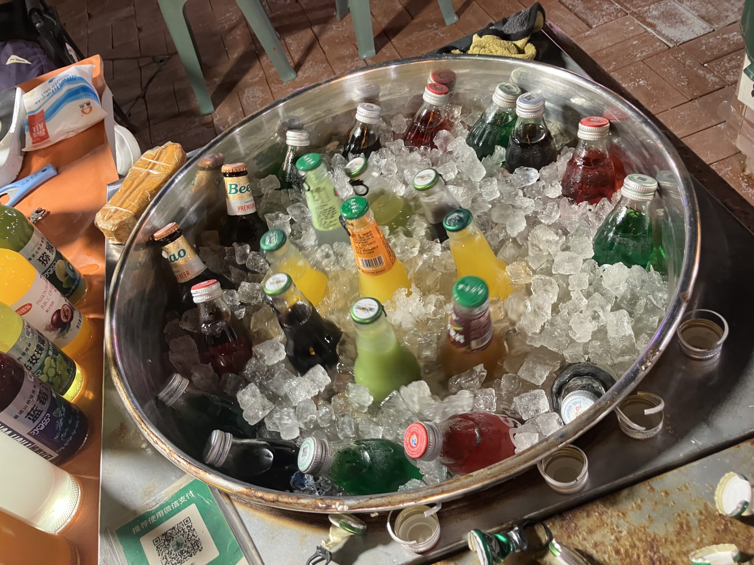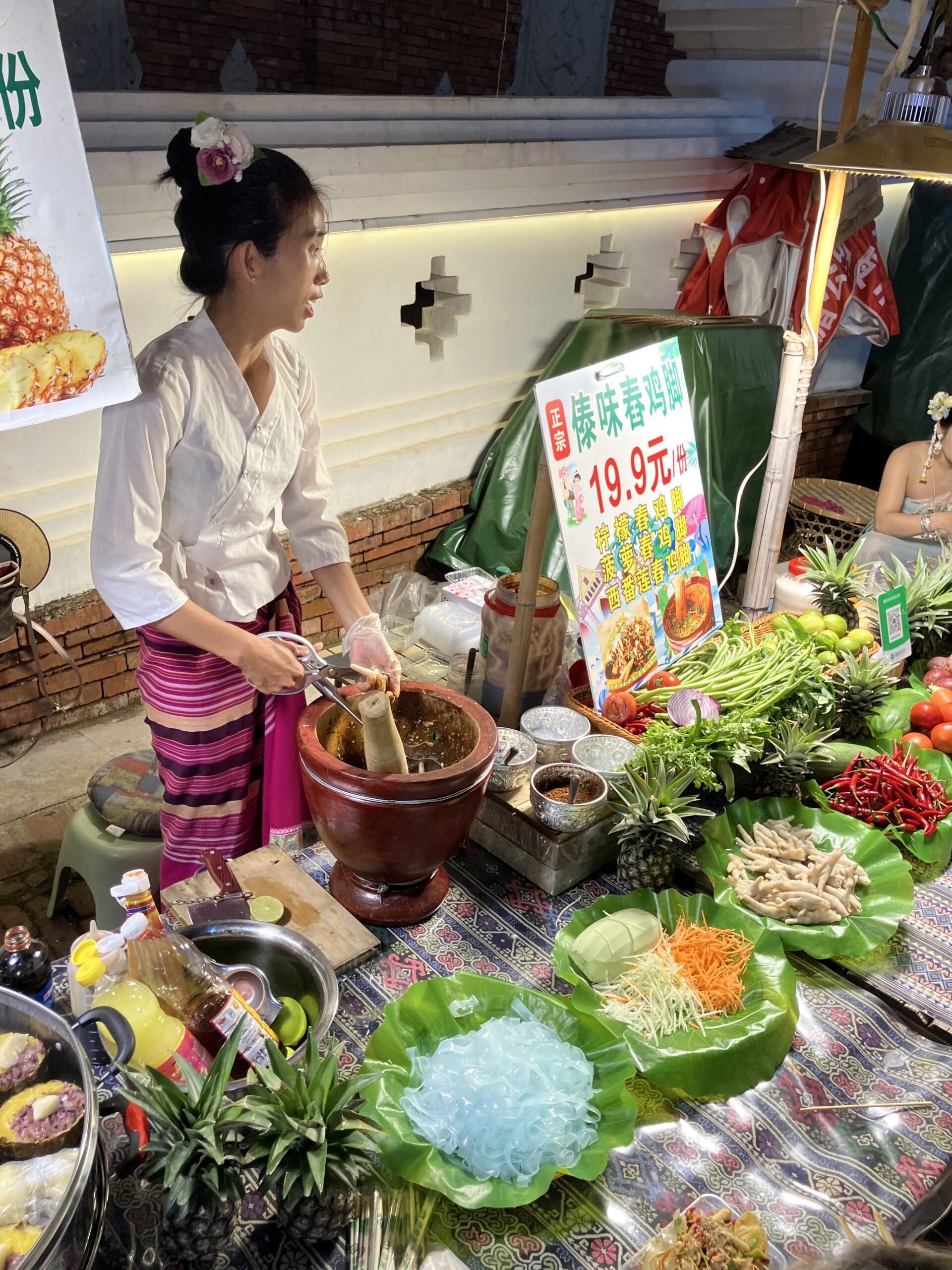 とはいえ、東南アジア最大を冠するだけのことはあって、その規模はじつに壮大。歴史の年輪はなさそうだが、それっぽい建築物やオブジェも随所に配されており、否が応でもお上りさんのテンションはあがる。ちょっとした軽食、割にしっかりしたレストラン、ズンチャ系音楽のかかるミュージック・バー、いかにも観光客向けの土産物と民芸品、などなど、われわれが通常のマーケットに期待する以上のものが、ほぼ全て揃っている。ソムタム (タイの青パパイヤサラダ) をタイ同様に壺で和えてくれる屋台や、タイ風バーベキューの店も数多あるので、やはり「国内なのにタイっぽい」というのが、西双版納の売りなのだろう。