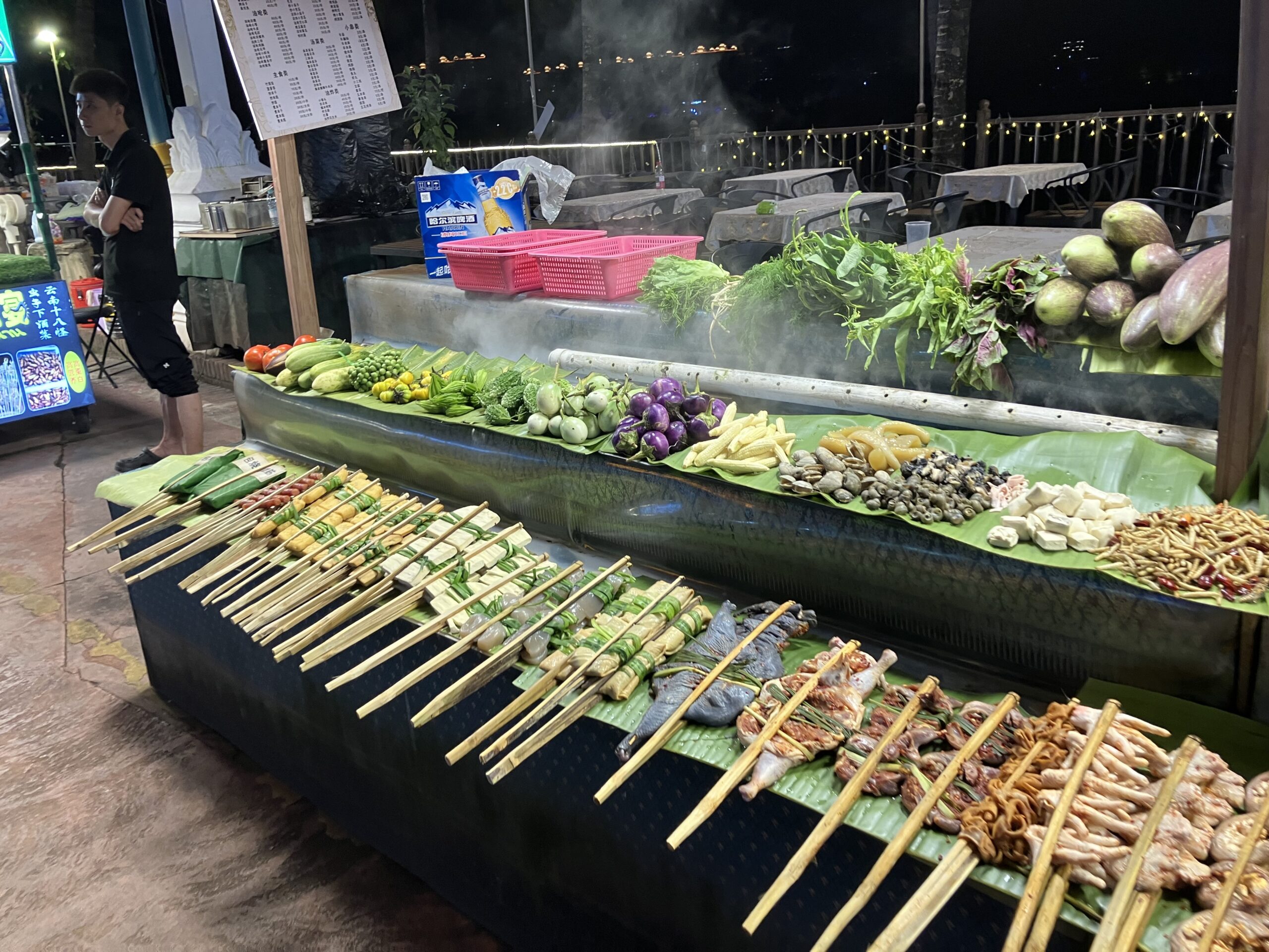 景洪には、メコン川を挟んだ旧市街、新市街のどちらにも夜市がある。本来なら、夜な夜な「市が立つ」とでも日本語で表現すべきだが、どうやら半恒久的な施設のようなので、そこに市場がある。ということになる。せっかくなので、より規模の大きい新市街の星光夜市を目指してみる。前述の告庄の街をぶらぶら歩いていれば、どうしたってこの夜市に突き当たるので、道に迷う心配をする必要はない。ちなみに星光夜市の中心部はゲートで区切られており、入場にあたっては WeChat で登録をする必要がある。登録の操作自体は難しくはないが、こうしたことからも、これが自然発生的なマーケットではなく、ある種、お仕着せの観光スポットなのだと邪推することもできる。