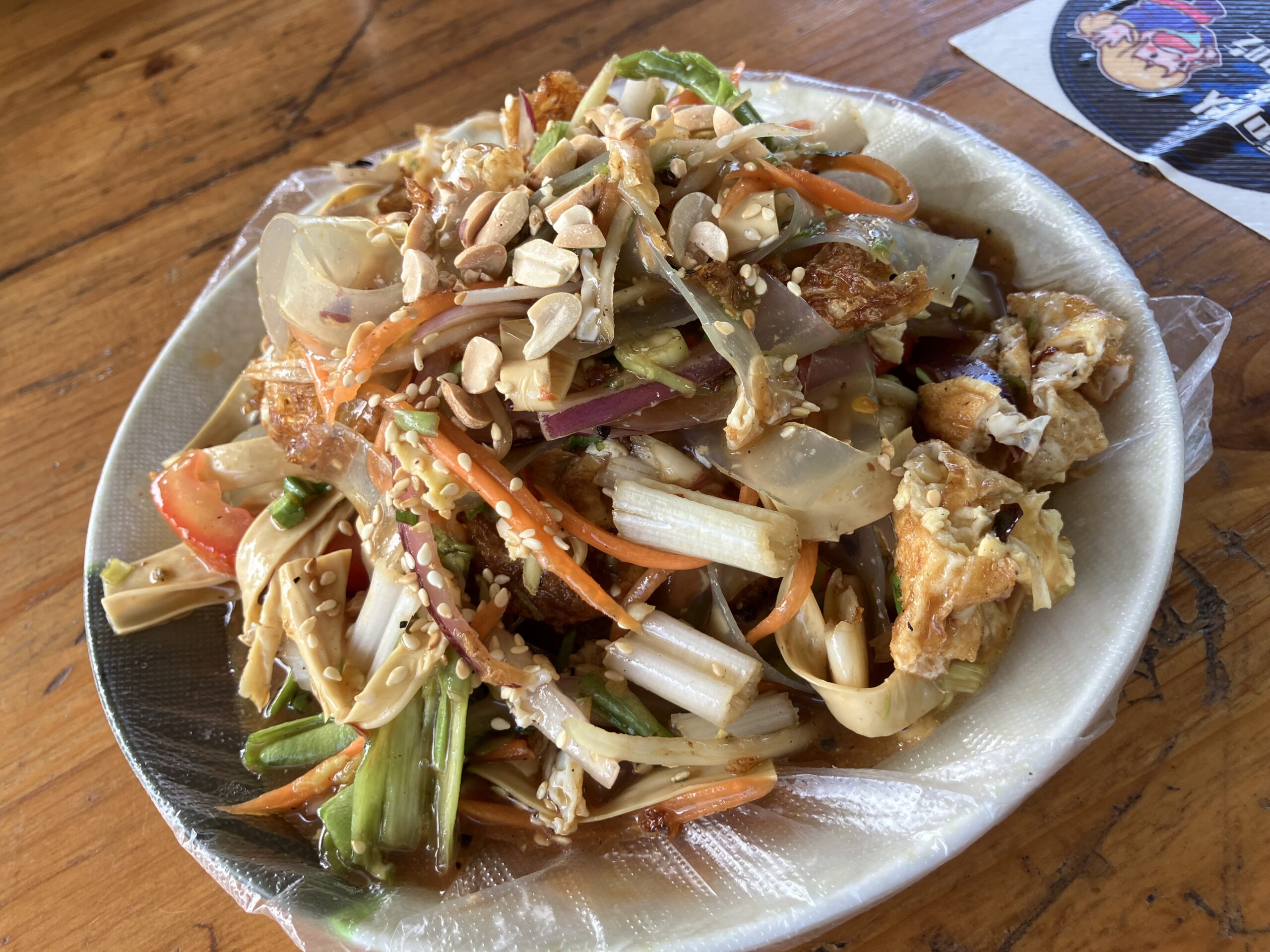 橄欖壩大橋の橋脚下には、塩梅よく夜市があり、休憩もかねてここで昼食をとった。夜市で昼食というのは、「清楚系港区女子」みたいで、なんだか矛盾しているような感じもするが、タイ族店主おすすめの和え物は、たいへん美味しゅうございました。