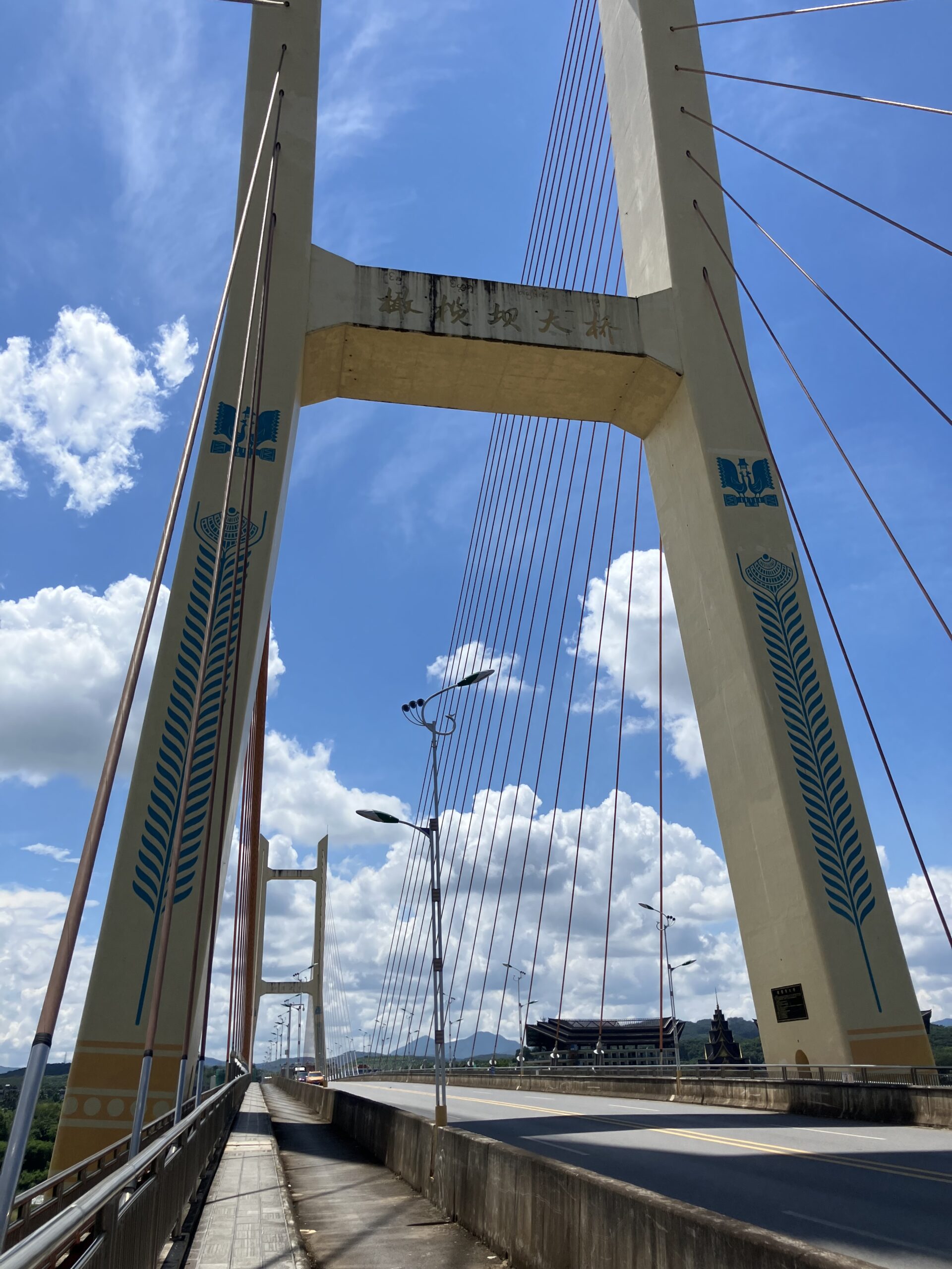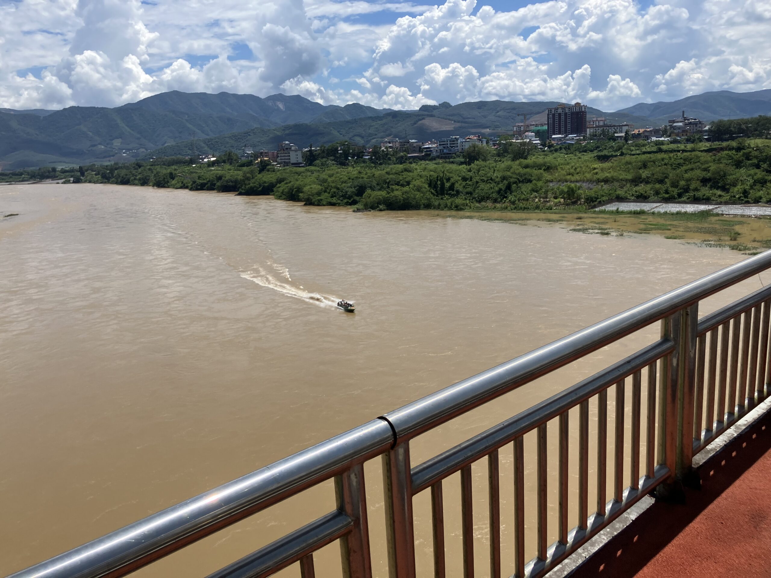 せめてメコン川をもっとよく眺められる場所に行こうと、傣族園を出て橄欖壩市街地の橄欖壩大橋まで歩く。朝方は、涼しくて随分歩きやすかったものだが、昼時になると命の危険を感じるほどに暑く、陽射しが強い。さいわい徒歩で橋を渡ることができるようなので、やっとの思いで階段を登り、上流側だか下流側だかよくわからないが、とにかくメコンの滔々たる流れを堪能する。折りよく、例のスピードボートの勇姿も、ここから認めることができた。